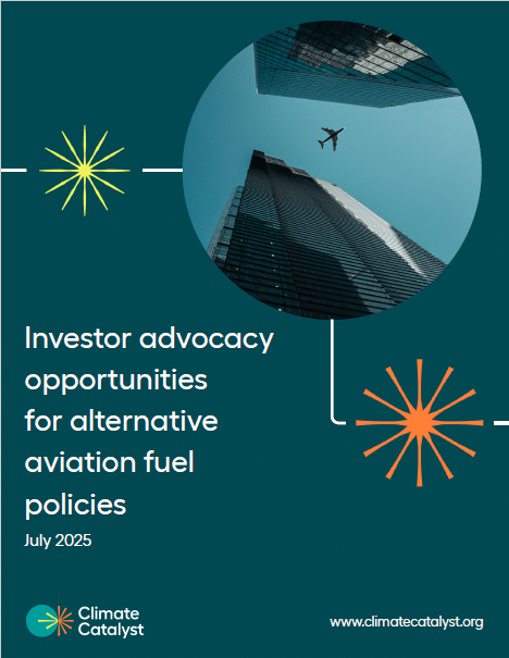 - Leverage investor stewardship and corporate engagement to ensure aviation companies and fuel suppliers disclose their policy positions and alternative fuel strategies, such as SAF procurement policies, and undertake due diligence in partnerships and investments including direct investments, firm offtake agreements, and venture capital investments in prospective e-fuel projects.